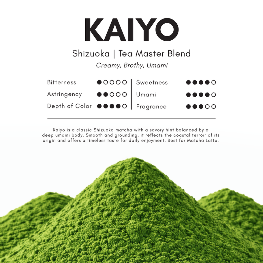Kaiyo is a classic Shizuoka matcha with a savory hint balanced by a deep umami body. Smooth and grounding, it reflects the coastal terroir of its origin and offers a timeless taste for daily enjoyment. Best for Matcha Latte.