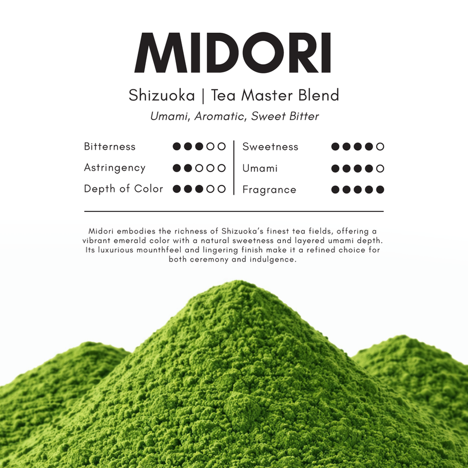 Midori embodies the richness of Shizuoka’s finest tea fields, offering a vibrant emerald color with a natural sweetness and layered umami depth. Its luxurious mounthfeel and lingering finish make it a refined choice for both ceremony and indulgence.